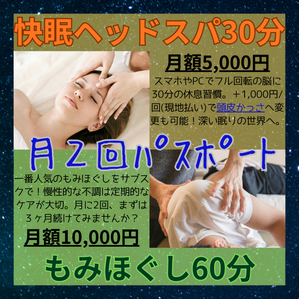 こんにちは。Reizvollです。 4月より【快眠ヘッドセラピー30分】と【もみほぐし60分】のサブスクリプションを開始致します。