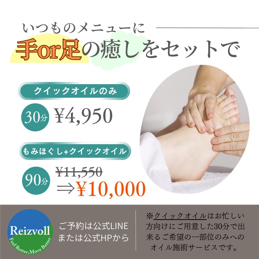 今年からスタートした【クイックオイル30分】を【もみほぐし60分】とセットにしてみました!