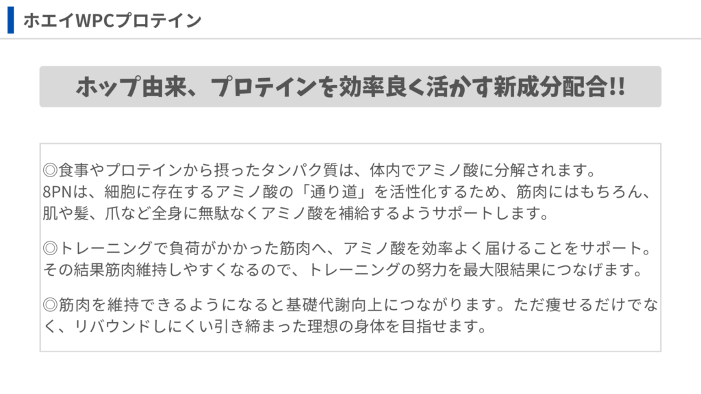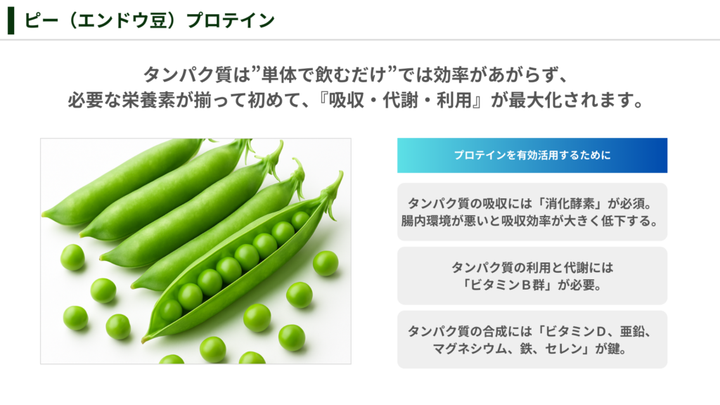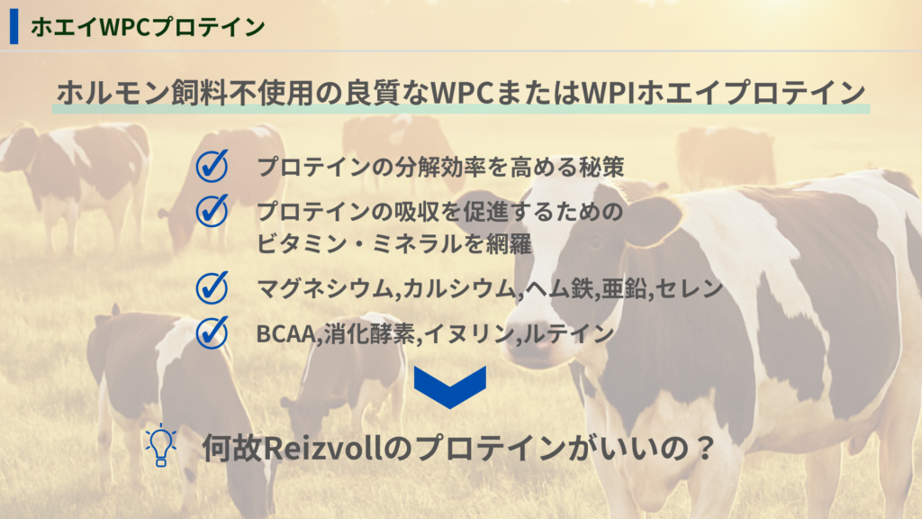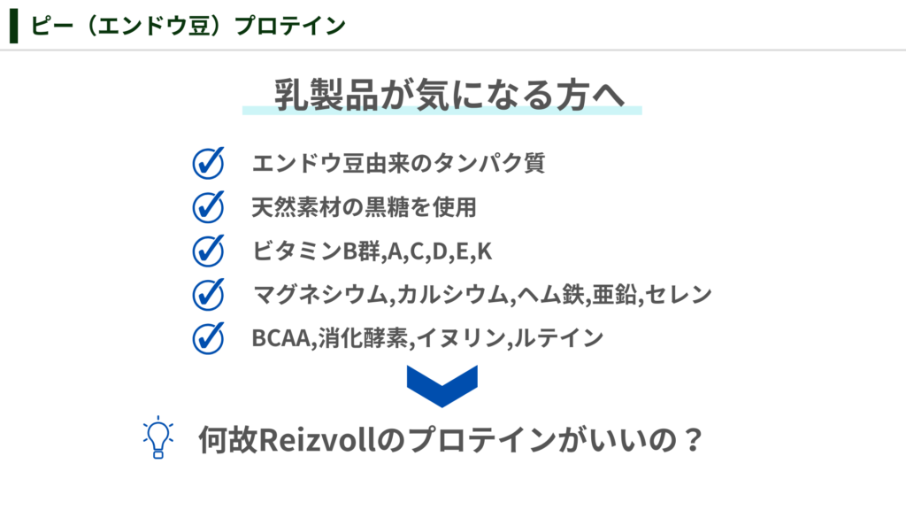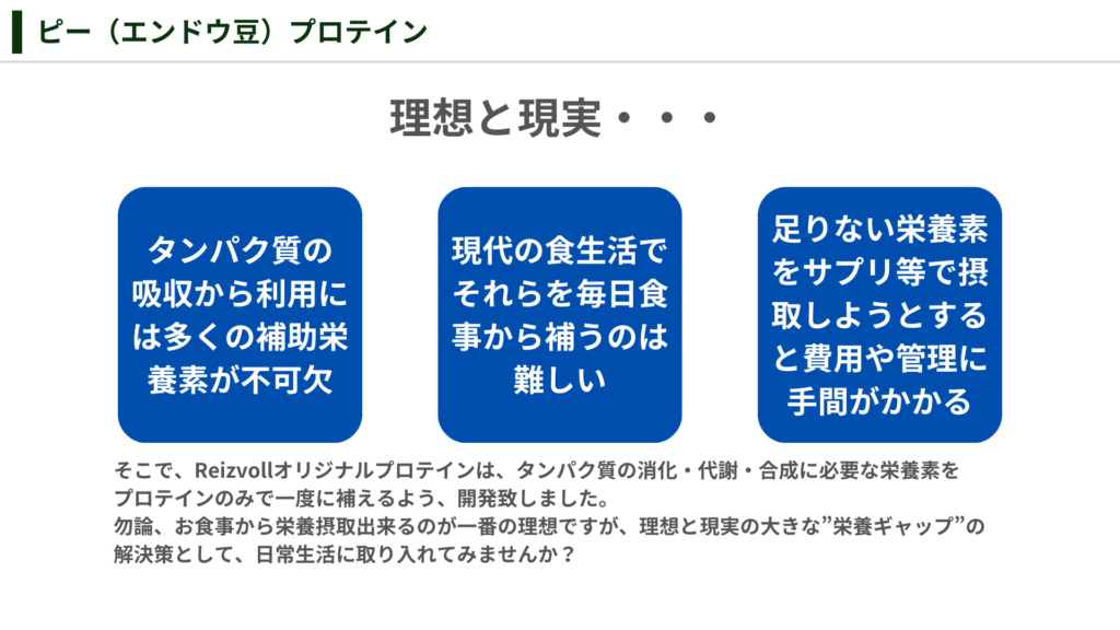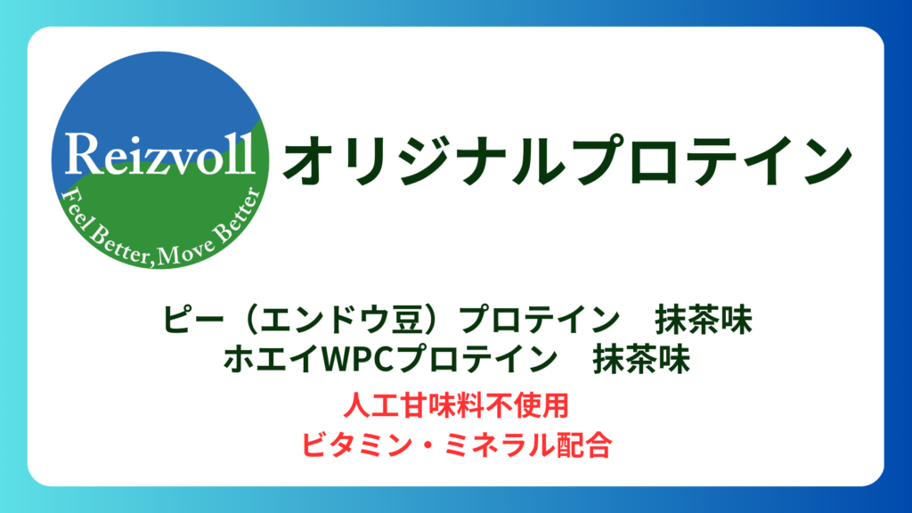 Reizvoll オリジナルプロテイン 販売中! Menu①ピー(エンドウ豆)プロテインについて②ホエイWPCプロテインについて③オススメの飲み方④タンパク質について⑤よくある質問⑥金額・購入方法 Reizvoll へ