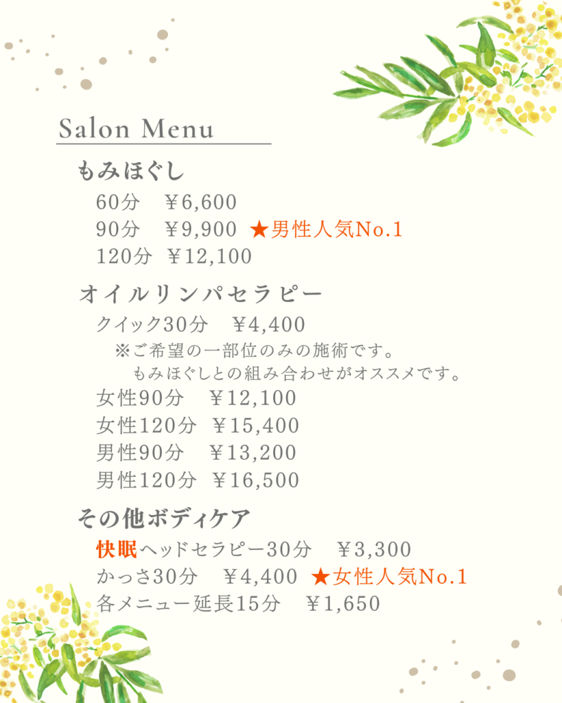 また、オイルを使った施術では、リンパを優しく流し、身体の内側からスッキリと整えます。